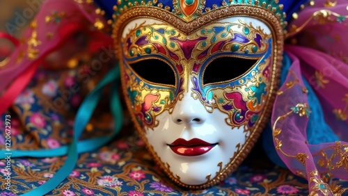 Fototapeta premium Colorful venetian masquerade mask with intricate designs and gold accents on...