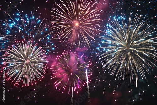 © SaroStock, Naklejka premium Colorful, vibrant fireworks display., Vector design featuring a mesmerizing display of fireworks against a deep black sky