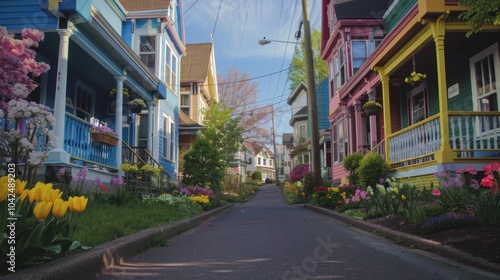 © Imsuniyah, Fototapeta premium Colorful Victorian Houses on a Spring Street