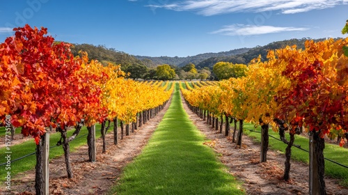 Obraz premium Colorful vineyards rows stretching into the distance in autumn