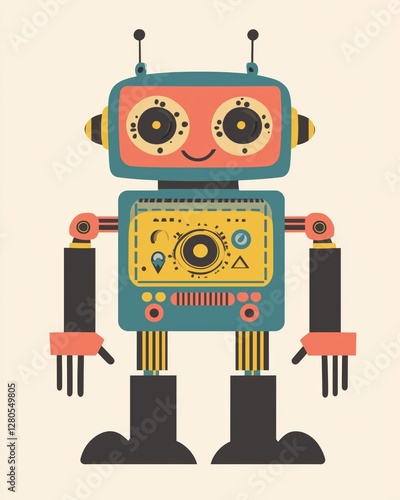 Fototapeta premium Colorful vintage robot character illustration Whimsical style AI robotic icon flat art design