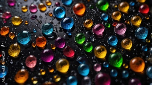 Naklejka premium Colorful water droplets on black surface, macro shot, abstract background, ideal for design