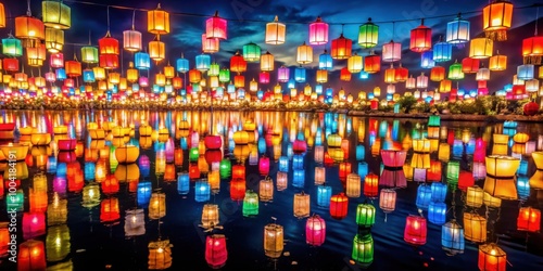 Obraz premium Colorful Water Lanterns Light Up Night Sky in Stunning Display for Festive...