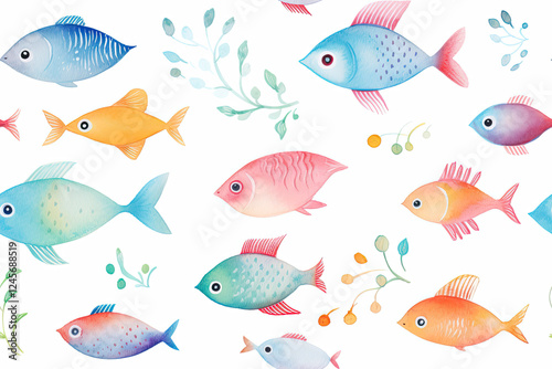 © Yuriani, Naklejka premium Colorful Watercolor Fish Seamless Pattern Illustration