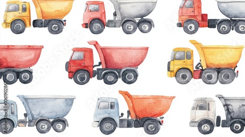 Fototapeta premium Colorful watercolor illustration of various construction trucks, perfect for children's art, invitations, and educational materials.