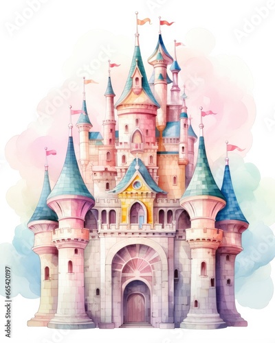 Obraz premium Colorful watercolor kawaii castle isolated on white background.