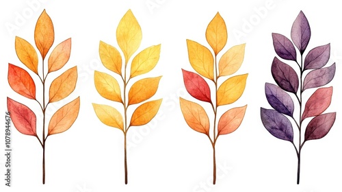Fototapeta premium Colorful watercolor leaves arranged in a decorative pattern on a white background.