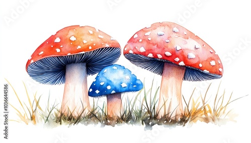Obraz premium Colorful watercolor mushrooms in a grassy field, showcasing vibrant red and blue caps with white spots, perfect for nature themes.