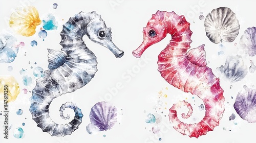 © FarhaStock, Fototapeta premium Colorful Watercolor Seahorses with Shells on a Soft Background Perfect for Aquatic Themes