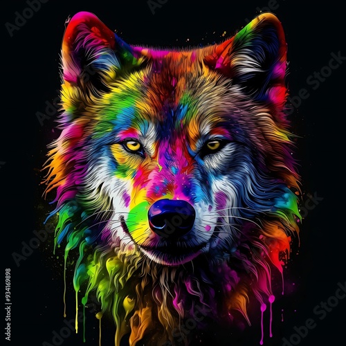 © Gerges, Naklejka premium Colorful watercolor wolf portrait with vibrant hues and intricate details against a black background