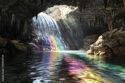 Fototapeta premium Colorful waterfalls cascade in a serene cave with rainbow hues and tranquil waters
