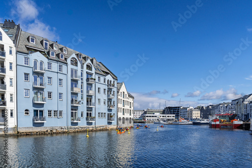 © Frankix, Naklejka premium Colorful Waterfront Houses with Recreational Activity Under Clear Blue Sky, Aalesund, Norway