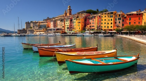 © kirania, Obraz premium Colorful waterfront scene with boats moored at a harbor.
