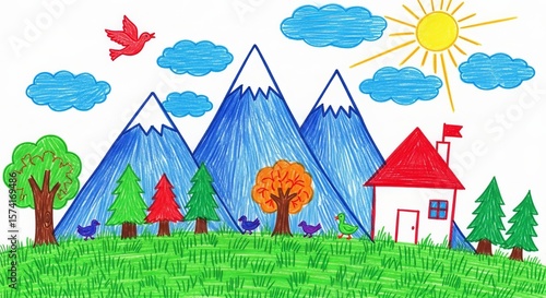 © AsrorCreate, Naklejka premium Colorful whimsical childlike drawing of a mountain scene with birds, trees, and a small house