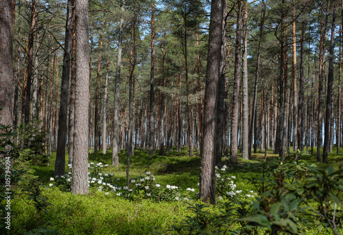 © Girts Pa, Obraz premium Colorful white Flowering Rhododendron in the wild sunny forest