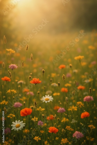 © olegganko, Fototapeta premium Colorful Wildflower Field During Golden Hour in the Countryside