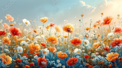 Obraz premium Colorful wildflowers field at sunset, nature background