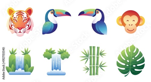 © joo, Obraz premium Colorful wildlife and nature elements tiger toucan monkey waterfalls bamboo leaf