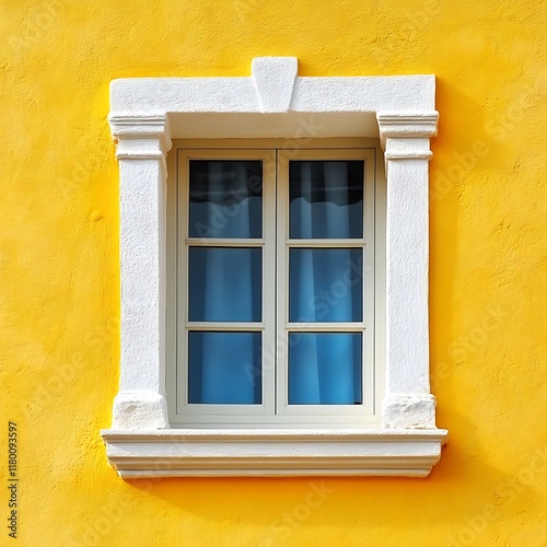 © Kajol, Fototapeta premium Colorful window on yellow wall with blue wooden shutters. Abstract background