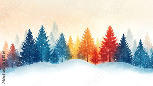© Shahazadi, Naklejka premium Colorful winter forest landscape with vibrant trees under a soft snowfall