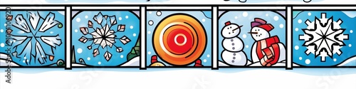 Fototapeta premium Colorful winter scene with snowflakes and snowmen in a festive artistic design.