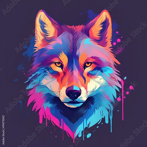 © Gerges, Naklejka premium Colorful Wolf Head Portrait Against Dark Background