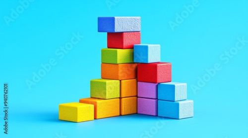 © Aris Suwanmalee, Obraz premium Colorful wooden blocks stacked in a pyramid shape against a blue background.