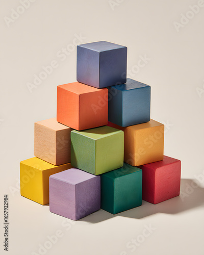 © 77, Obraz premium Colorful Wooden Blocks Stacked in a Pyramid Shape on Neutral Background