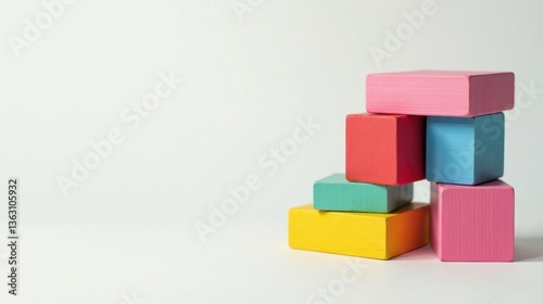 © Sumrit, Obraz premium Colorful Wooden Blocks Stacked in an Unstable Formation on a White Surface