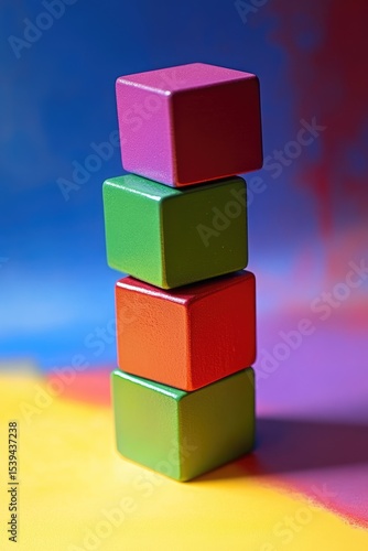 © yalli, Obraz premium Colorful wooden blocks stacked vertically against a vibrant multicolored background
