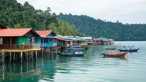 © Puttipong, Naklejka premium Colorful Wooden Houses on Stilts by Serene Tropical Waters