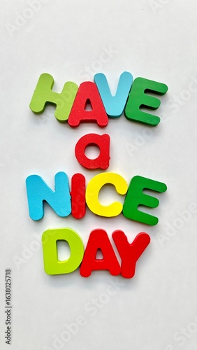 © Al-Jabbar99, Naklejka premium Colorful Wooden Letters Spelling "Have a Nice Day" on White Background