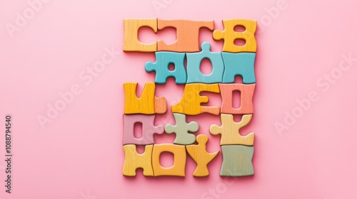 Obraz premium Colorful Wooden Puzzle Pieces Spelling