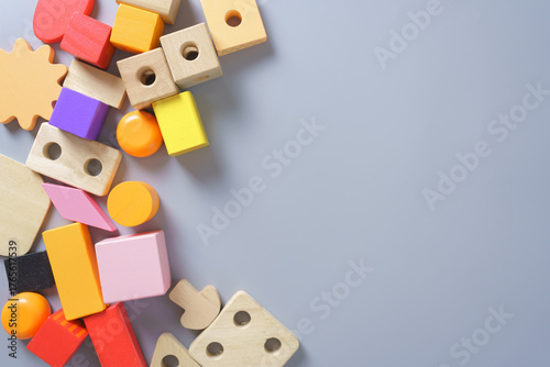 Obraz premium Colorful wooden toy blocks in various shapes on gray background, concept for...