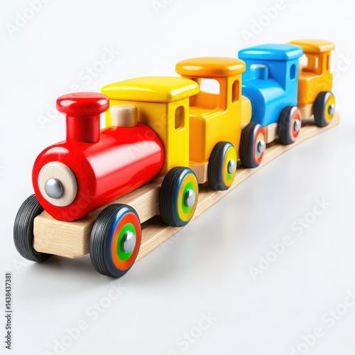 © UKPixelCraft, Fototapeta premium Colorful wooden toy train close up on white background