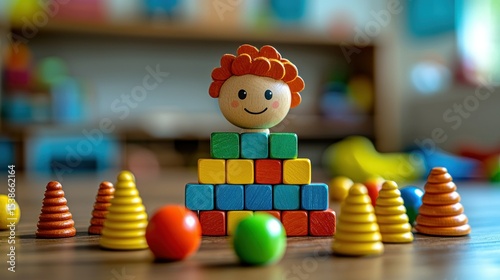 © Dece Std, Naklejka premium Colorful wooden toys arranged on a table