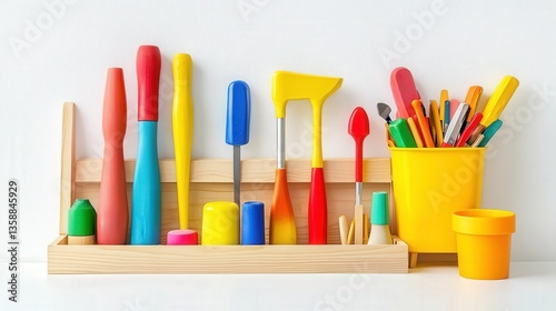 Fototapeta premium Colorful Wooden Workbench with Assorted Tools