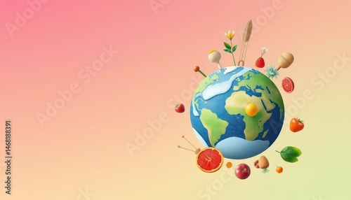 Naklejka premium Colorful world globe with floating fruits and leaves for a healthy planet