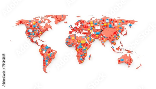 © Kittima, Obraz premium Colorful World Map Depicting Global Concepts with Visual Symbols and Representations on a White Background