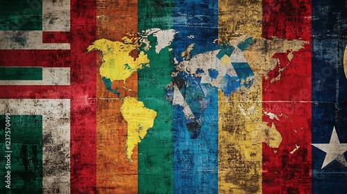 Fototapeta premium Colorful World Map on Weathered Flags Background Symbolizing Global Diversity...
