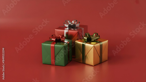 © Pankaj, Fototapeta premium Colorful Wrapped Christmas Gift Boxes Isolated on Red Background
