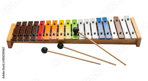 © ArsiStudio, Naklejka premium Colorful Xylophone Glockenspiel Musical Instrument with Wooden Frame and Mallets isolated on Transparent Background