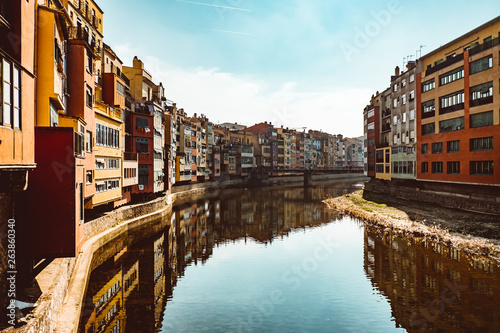 Fototapeta premium Colorful yellow and orange houses and famous house Casa Maso reflected in water river Onyar