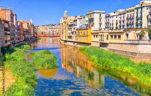 Obraz premium Colorful yellow and orange houses in historical jewish quarter of Girona,...