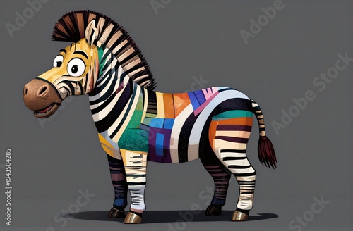 © joeycheung, Fototapeta premium Colorful zebra with playful expression stands against gray background