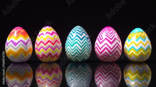 © pinporn manosri, Naklejka premium Colorful Zigzag Patterned Easter Eggs Displayed on Black Surface