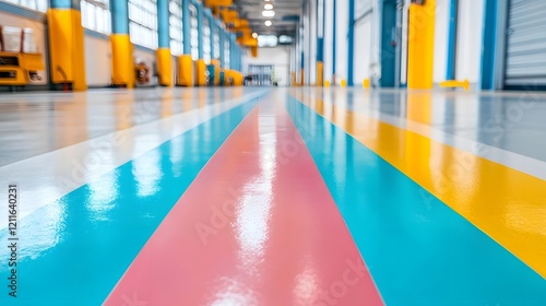 Fototapeta premium Colorful Zoned Factory Floor for Safety and Navigation in Industrial Warehouse