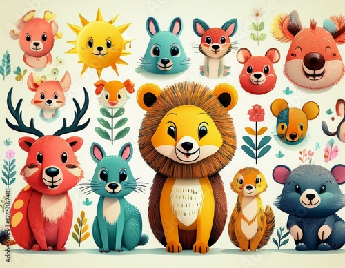 © Argiduna, Naklejka premium Colorido dibujo de dibujos animados con animales del bosque lindos y caras soleadas en un fondo ligero