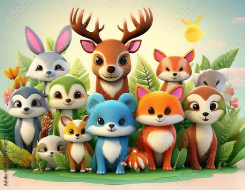 Naklejka premium Colorido dibujo de dibujos animados con animales del bosque lindos y caras soleadas en un fondo ligero