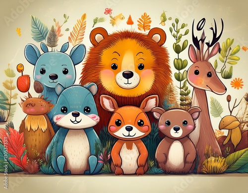© Argiduna, Naklejka premium Colorido dibujo de dibujos animados con animales del bosque lindos y caras soleadas en un fondo ligero
